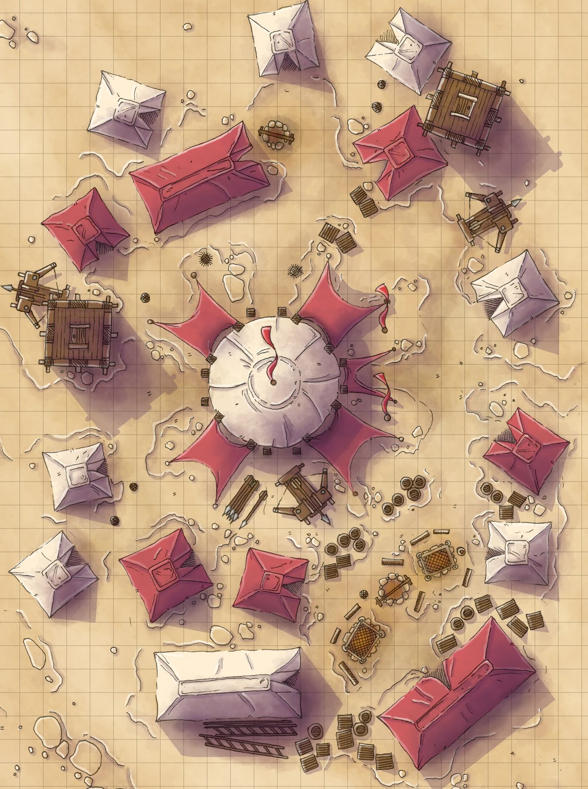 Les tentes du camp, disciplinées et majestueuses, dessinent un vaste cercle autour du refuge de la divine championne de Iomedae, sanctuaire de la justice feu et du courage. Chacune, ourlée d’écarlate et frappée des armoiries de la divinité, abrite les compagnons d’armes, pages, écuyers et gardes fidèles. Les lances dressées à la verticale servent de mâts, où flottent fièrement les couleurs de Iomedae, et les boucliers, alignés devant chaque abri, témoignent de la bravoure et de la discipline qui animent la compagnie.