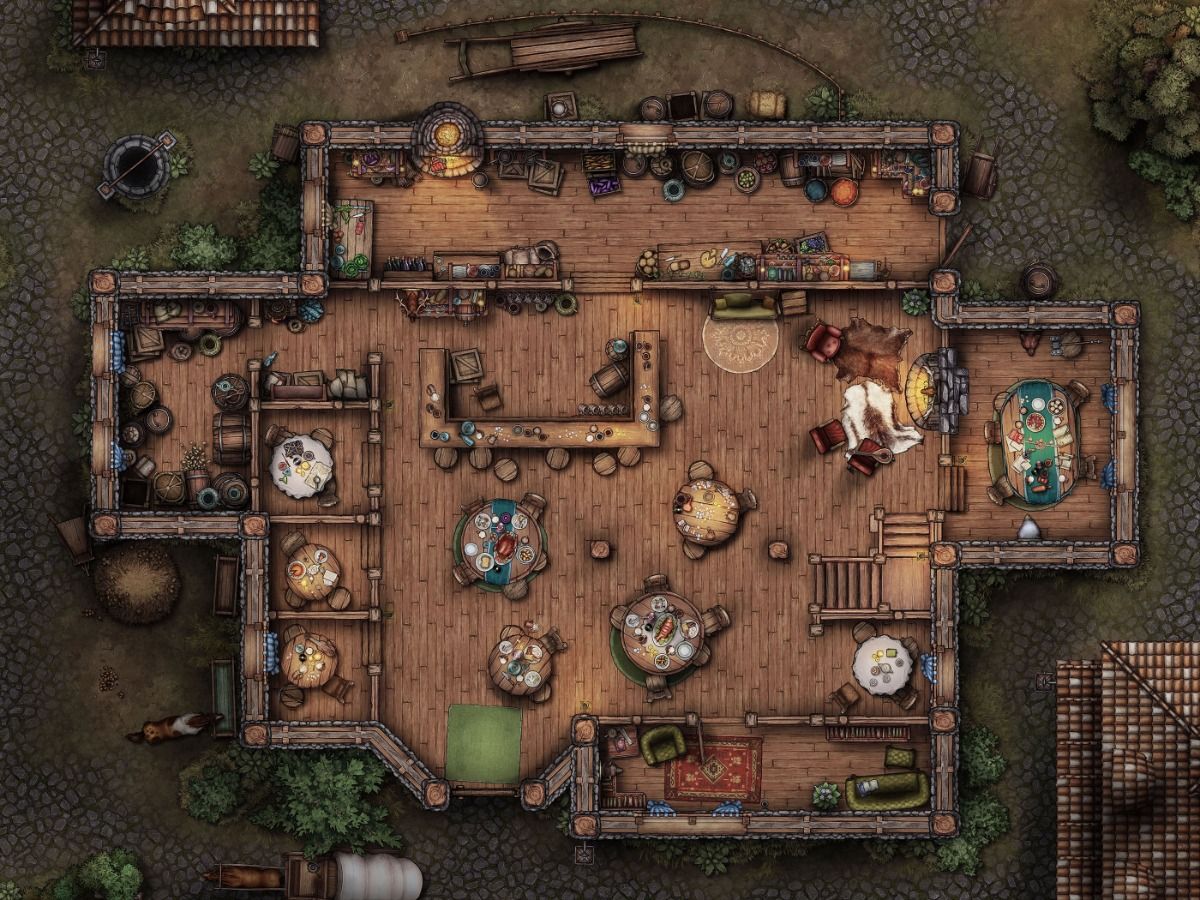 Au centre, plusieurs tables rondes de bois massif, usées par les années, accueillent voyageurs, mercenaires et bardes de passage. Des chandeliers en fer forgé y déposent une lumière dorée, faisant danser les ombres sur les murs.